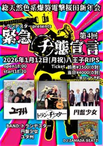 « イベント一覧 このイベントは終了しました。 1月12日 八王子RIPS 総天然色系爆裂電撃桜田新年会 トランヂスターpresents 緊急ヂ態宣言 第四回 « KOBE ROCK’N’ROLL CIRCUS 2026 THE RAPTOLS『音速四号』配信リリースイベント 「ラプトル中毒 vol.9」 » 出演:トランヂスター ユタ州 円盤少女 DJ:ZAMADA BEATZ 開場:18:00 開演:18:30 前売:¥3500 当日:¥4000 カレンダーに追加 Google カレンダー iCalendar Outlook 365 Outlook Live 詳細 日付: 1月12日 イベントカテゴリー: LIVE 会場 八王子RIPS 〒192-0084 東京都八王子市三崎町2−7 ヨーロービル 5 + Google マップ 会場 のウェブサイトを表示する この公演を予約する ご予約名 必須 メールアドレス 必須 ご予約枚数 必須 12345678910 その他何かあればご記入ください (任意)