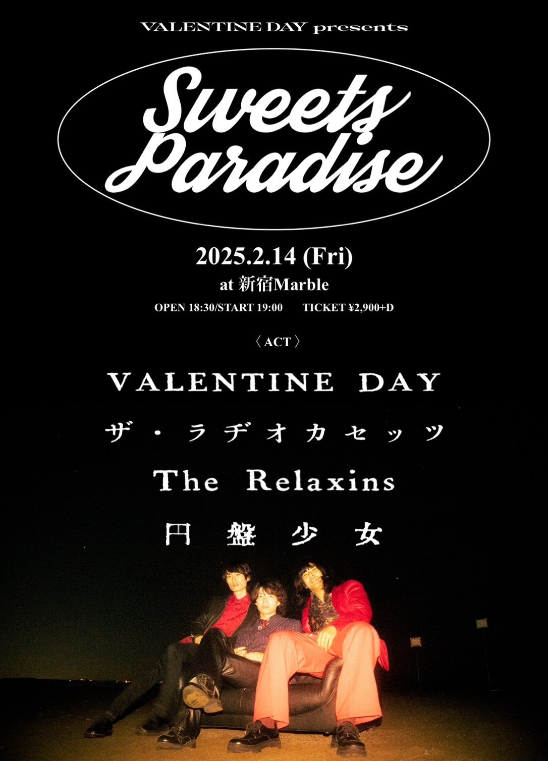 « イベント一覧 このイベントは終了しました。 2025年2月14日 新宿Marble VALENTINE DAY pre. 「Sweets Paradise」 « B&B Explosion DADAフェス×PunkyShgzParty » 出演:VALENTINE DAY ザ・ラヂオカセッツ The Relaxins 円盤少女 開場:18:30 開演:19:00 前売:¥2900 カレンダーに追加 Google カレンダー iCalendar Outlook 365 Outlook Live 詳細 日付: 2025年2月14日 イベントカテゴリー: LIVE 会場 新宿Marble 東京都新宿区歌舞伎町2-45-2 カイダ第3ジャストビルB1F + Google マップ 電話番号 080-3714-7554 会場 のウェブサイトを表示する この公演を予約する ご予約名 必須 メールアドレス 必須 ご予約枚数 必須 12345678910 その他何かあればご記入ください (任意)